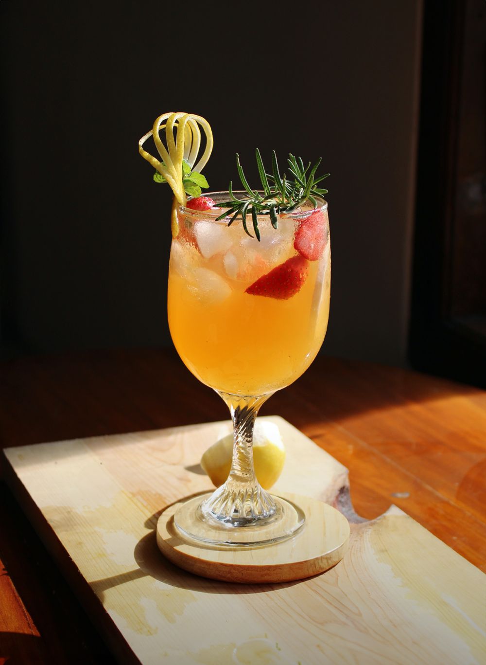rhubarb gin, Aperol, fresh strawberries, sparkling rose, soda splash -